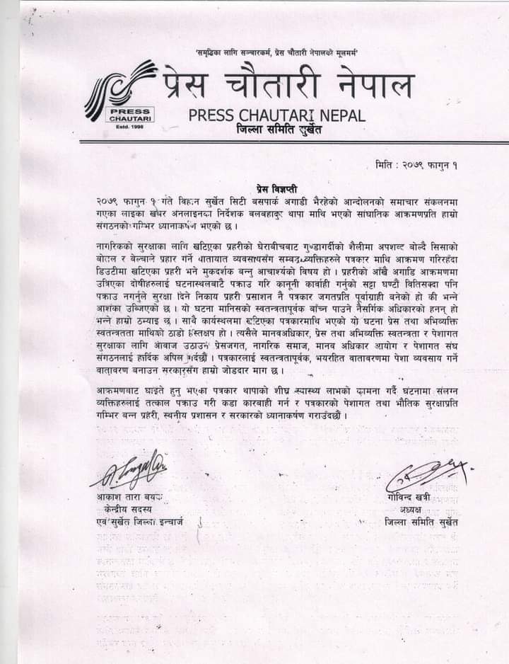 घटनाको बिरोध गर्दै प्रेस चौतारि नेपाल सुर्खेत ले दोसि उपर कारबाहि को माग गरेको छ । अध्यक्ष गोबिन्द खत्री र केन्द्रीय सदस्य आकाश तारा बयक द्वारा जारि बिग्यप्तिमा दोसिलाइ कारबाहि नभय आन्दोलन गर्ने चेतावनि समेत दिएका छन ।