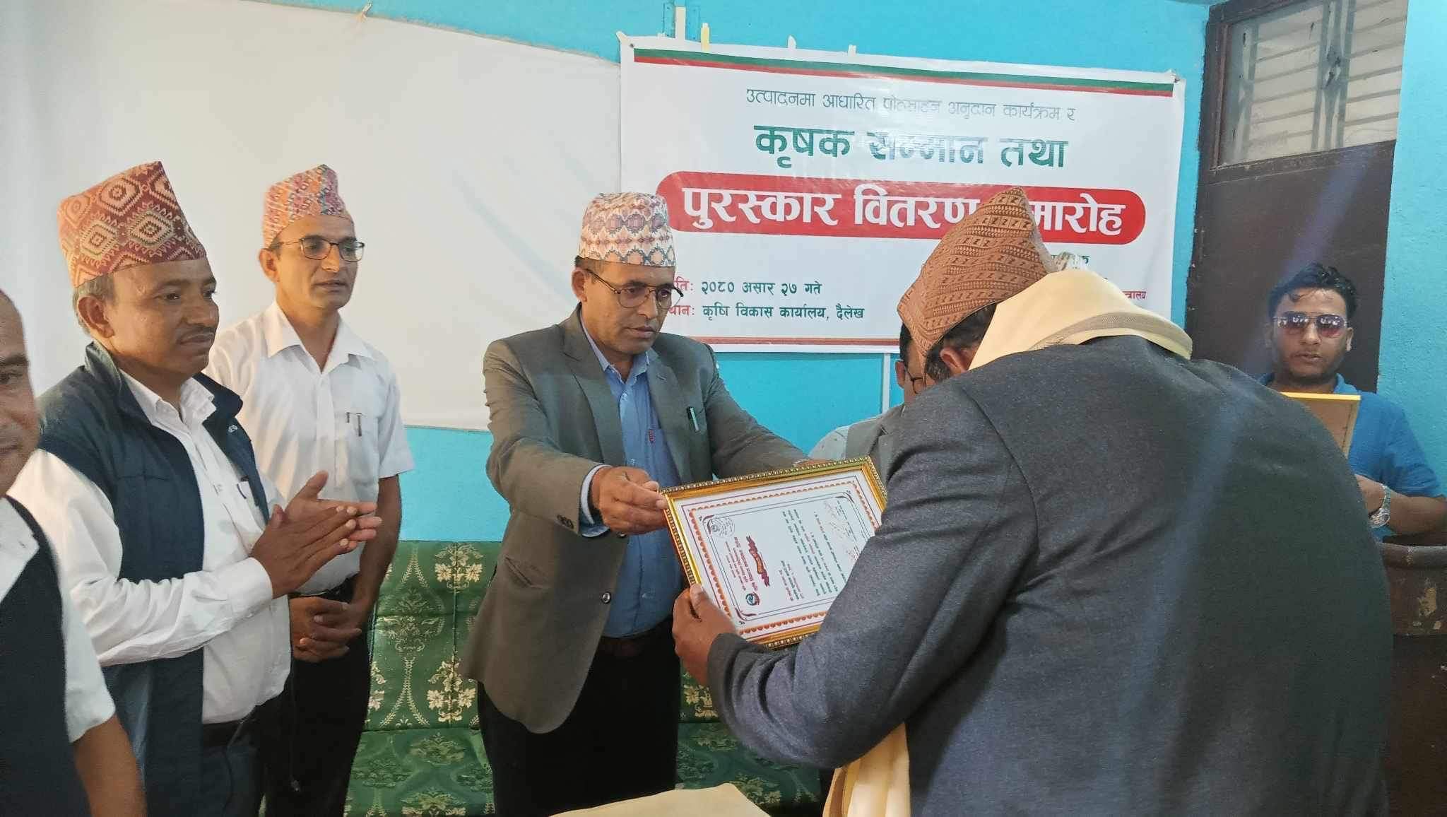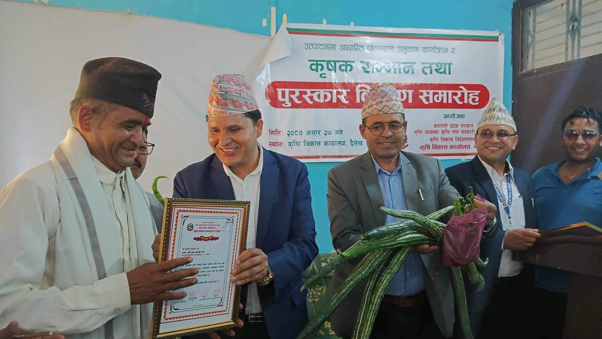 दैलेख – कृषि बिकास कार्यालय दैलेखले व्यवसायिक रुपमा कृषि गर्ने किसान लाई पुरस्कृत गरेको छ । दैलेख जिल्ला भरिका ५० जना ब्यावसायीक किसानलाई व्यवसायमा प्रोत्साहन गर्ने उदेश्यले पुरस्कृत गरिएको हो।